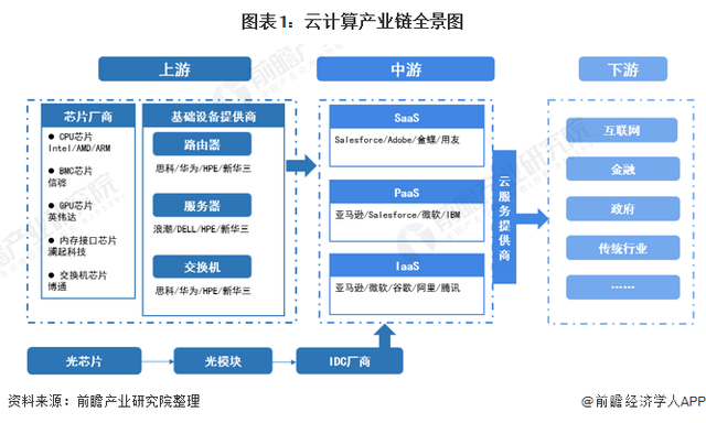 云计算产业链的核心是云服务厂商,海内外主要的厂商有亚马逊、微软、谷歌、Facebook、苹果、阿里、腾讯等互联网转型企业,提供弹性计算、网络、存储、应用等服务。互联网数据中心(IDC)厂商为之提供基础的机房、设备、水电等资源。基础设备提供商将服务器、路由器、交换机等设备出售给IDC厂商或直接出售给云服务商,其中服务器是基础网络的核心构成,大约占到硬件成本的60%-70%。CPU、BMC、GPU、内存接口芯片、交换机芯片等是基础设备的重要构成。光模块是实现数据通信的重要光学器件,广泛用于数据中心,光芯片是其中的核心硬件。云计算产业最终服务于互联网、政府、金融等广大传统行业与个人用户。