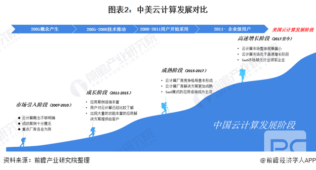 2007年以来,中国云计算的发展先后经历四个阶段:第一阶段为市场引入阶段,云计算的概念刚刚在中国出现,客户对云计算认知度较低;第二阶段为成长阶段,用户对云计算已经比较了解,并且越来越多的厂商开始踏入这个行业;第三阶段是成熟阶段,这个时候云计算厂商竞争格局已经基本形成,厂商们开始从更加成熟优秀的解决方案入手,SaaS模式的应用逐渐成为主流;第四个阶段是高速增长阶段,在这个阶段我国云计算市场整体规模偏小,落后全球云计算市场3至5年,且从细分领域来看,国内SaaS市场仍缺乏行业领军企业。