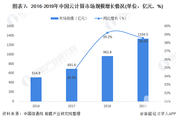 在我国,云计算市场从最初的十几亿增长至目前的千亿规模,行业发展迅速。据中国信息通信研究院披露的数据显示,2017-2019年期间,我国云计算行业的市场规模增速均在30%以上,呈高速增长态势。2019年,我国云计算市场规模达1334亿元,同比增长38.6%。未来,受益于新基建的推进,云计算行业仍将迎来黄金发展期。