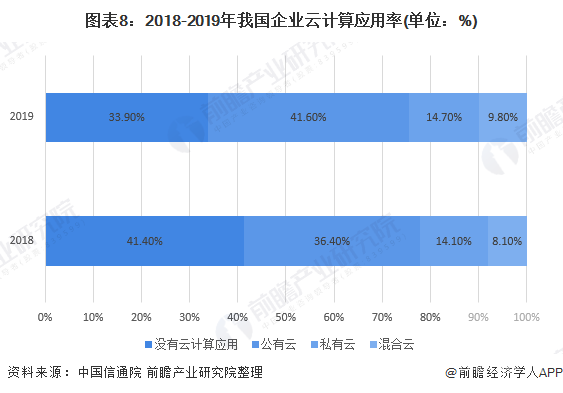 根据中国信息通信研究院的云计算发展调查报告,2019年我国已经应用云计算的企业占比达到66.1%,较2018年上升了7.5%。其中,采用公有云的企业占比41.6%,同比提高了5.2%;私有云占比为14.7%,同比小幅提升;有9.8%的企业采用了混合云,同比提高了1.7%。