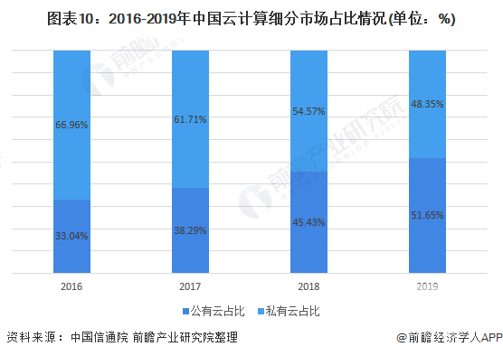 从细分市场来看,2016-2019年,公有云市场占比逐年提升,2019年为51.65%;私有云市场占比逐年下降,2019年为48.35%。2019年我国公有云市场规模达到689.3亿元,私有云市场规模达到645.2亿元,公有云市场规模首次超过私有云。