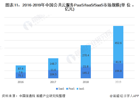从公有云细分市场来看,与全球发展现状不同的是,目前,我国云计算以IaaS(基础设施即服务)市场的发展最成熟。2019年,我国公有云laaS市场规模达到452.6亿元,较2018年增长了67.4%,占公有云市场规模比重达65.66%,预计未来受新基建等政策影响,laaS市场会持续攀高。同时,参考全球云计算市场发展现状,我国SaaS(软件即服务)市场将有极大的发展潜力,2019年,公有云SaaS市场规模达194.8亿元,同比增长34.2%。