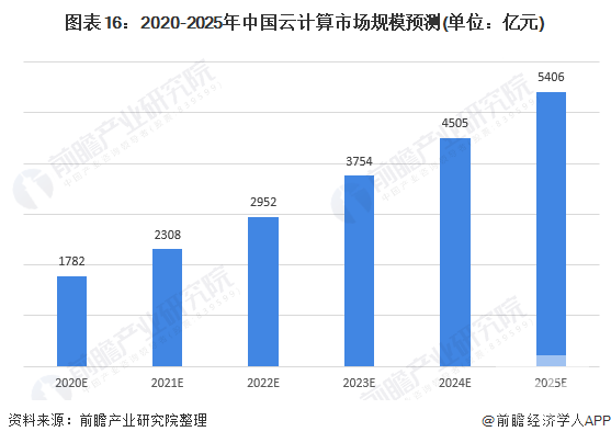 根据中国信通院数据预测,我国公有云市场2020-2022年仍将处于快速增长阶段,私有云未来几年将保持稳定增长。据此,前瞻预计2020年我国云计算整体市场规模将达到1782亿元左右,到2025年市场规模有望突破5400亿元。