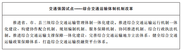 (1)深化体制机制改革。完成“综合交通运输体制机 制改革”交通强国试点任务,优化完善机构职能,深入推 进交通运输综合执法改革。持续探索交通运输主管部门对 重点交通运输企业履行业务指导和监管职能的新模式,完 善行业指导监管机制,构建事权清晰、有机衔接、政令畅 通、协同高效的一体化综合交通运输体制机制。