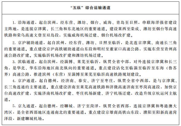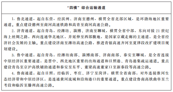 1.完善四横五纵通道。积极融入国家京津冀—长三角主 轴、京哈走廊和京藏走廊。在基本形成鲁北、济青、鲁南 三个横向通道基础上,加快完善鲁中横向通道,提升沿海 港口辐射能力和西向铁水联运效能,积极融入共建“一带 一路”高质量发展;在基本形成沿海、京沪辅助、京沪、 京九四个纵向通道基础上,加快完善滨临纵向通道,强化 与京津冀、长三角区域连接。