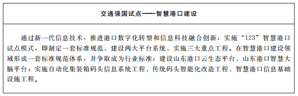 2.建设两个智慧化试点工程。按照新基建部署要求,推 进交通运输信息化向数字化、网络化、智能化发展,推动 “交通链”向“数据链”转变。加快以智能设施、车路协 同、船岸协同等技术为特征的“智慧高速”“智慧港口” 两个试点工程建设。开展交通强国“智慧高速公路系统工 程研究及实践”试点,实施济青中线、京台高速泰安至枣 庄段智慧高速公路项目,在路网感知、车路协同、信息化 管服等方面实现新突破;利用滨莱高速原址保留路段,打 造全国首个面向无人驾驶的智能网联高速公路封闭测试基 地。完善国家干线公路视频监测网络,深化电子不停车收 费系统(ETC)门架应用,推进高精度数字化基础设施地图 和交通基础设施信息库建设,实现视频、气象、事件检测 等信息云上汇聚、全省网联。开展交通强国智慧港口试 点,实施自动化集装箱码头、传统码头智能化改造工程和 智慧港口信息化建设,打造世界领先的新一代智慧港口。