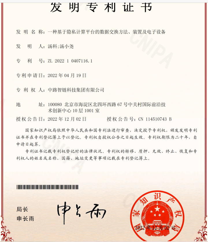 中路智链科技集团有限公司隐私计算技术团队自主研发的一种基于隐私计算平台的数据交换方法、装置及电子设备20221202日获中华人民共和国国家知识产权局授予发明专利授权,专利号:ZL 2022 1 0407116 .1。这是公司创立以来在隐私计算领域获得的第一项发明专利,也是公司获得的第八项专利。