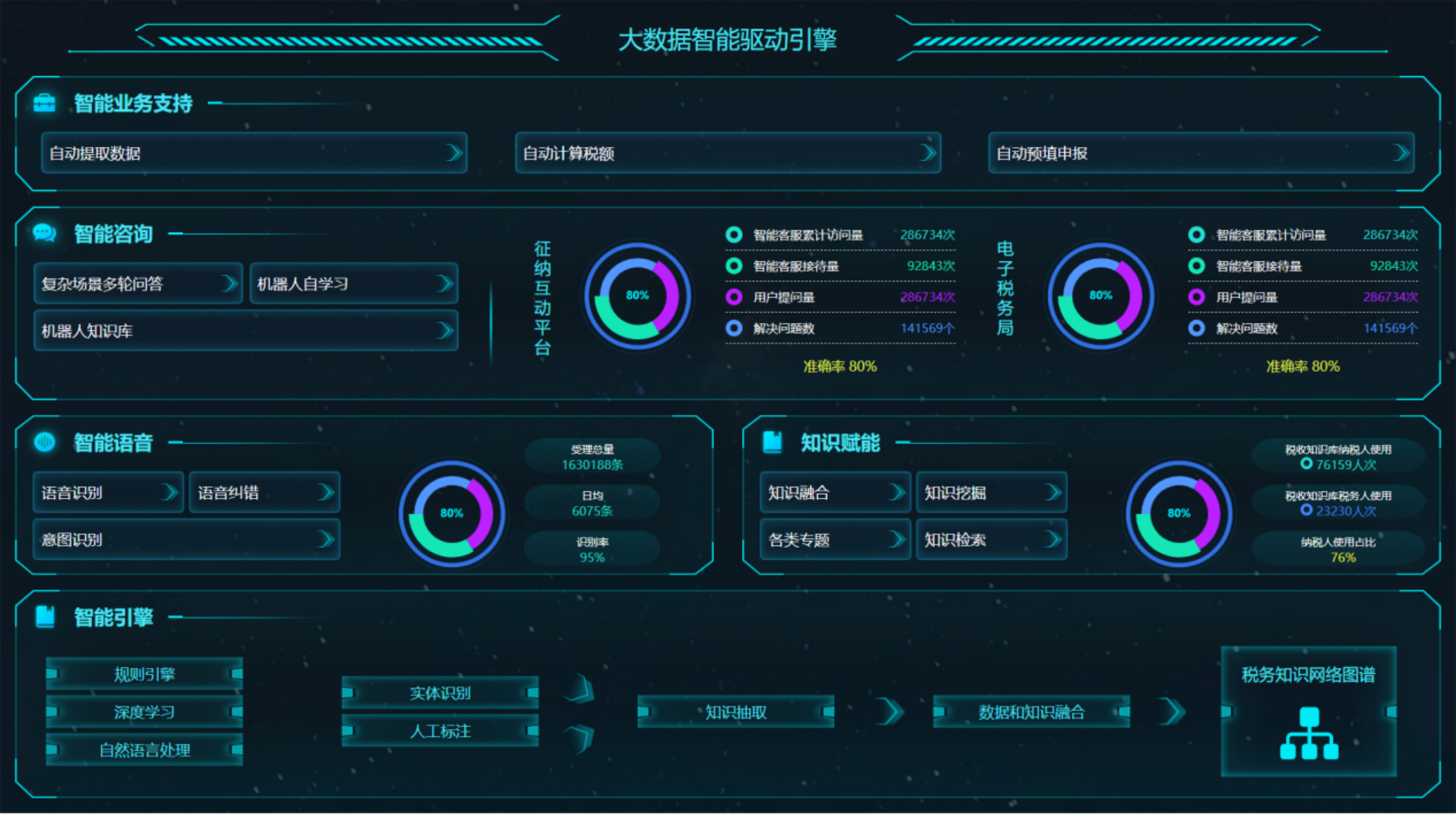 在与某省级税务局进行了长达一年的调研,沟通,设计,试点,研发,调试过程之后终于正式上线了‘智慧引擎’。该引擎依托大数据平台、规则引擎、深度学习、自然语言处理技术作为基础构架,提供智能咨询、智能之时图谱、智能语音、知识赋能等智能应用,将其能力部署到征纳互动平台和电子税务局与税收问答引擎深度集成,全面提升12366热线接通率和多渠道税收知识服务能力。