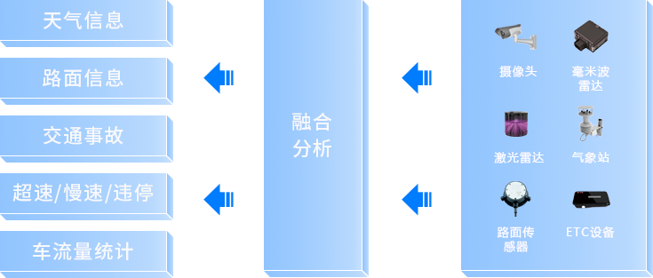 硬件系统架构 MEC 边缘计算设备融合了传统交通摄像头,雷达,ETC设备,结合天气、路面检测设备,为交管部门、车主提供车辆,天气,路面三方面的信息。