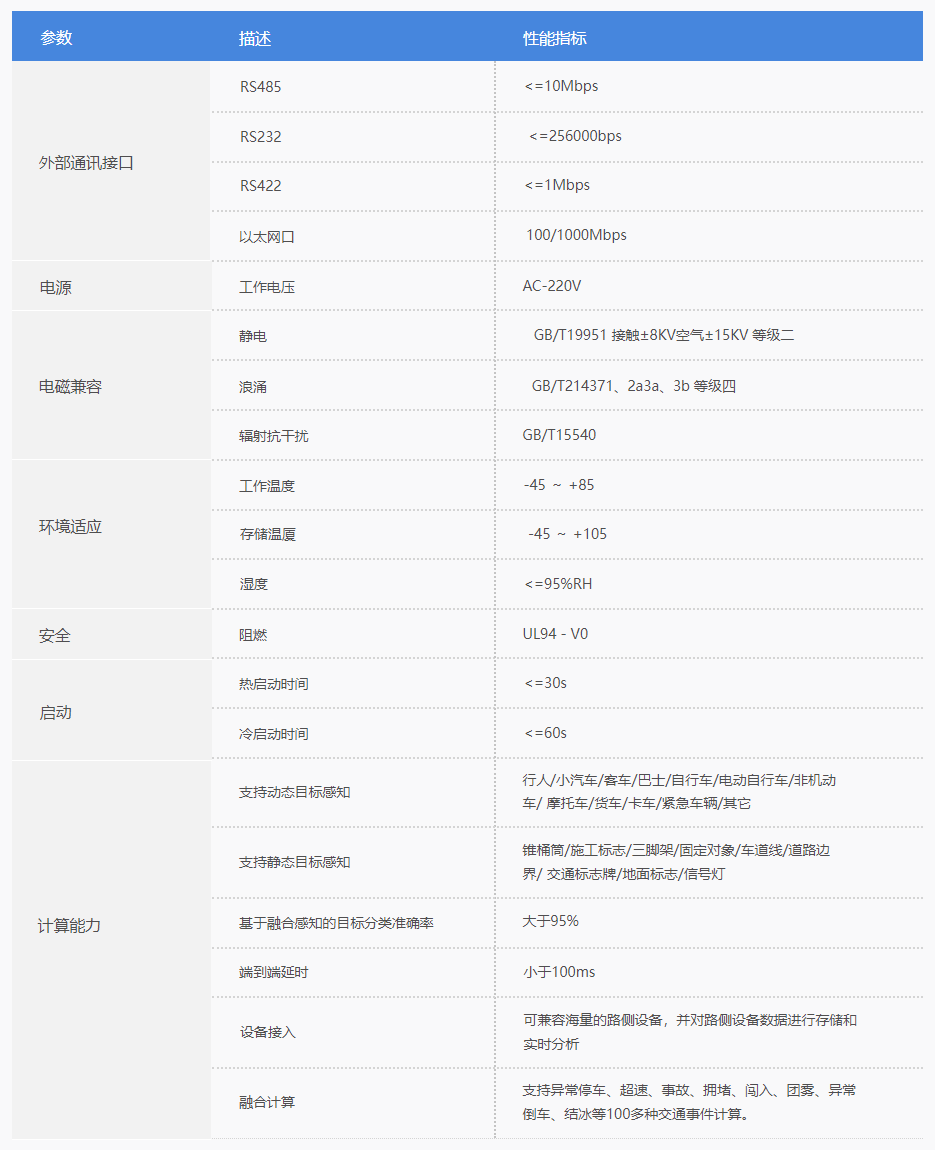 RS232 <=256000bps RS422 <=1Mbps 以太网口 100/1000Mbps 工作电压 AC-220V 静电 GB/T19951 接触±8KV空气±15KV 等级二 浪涌 GB/T214371、2a3a、3b 等级四 辐射抗干扰 GB/T15540 工作温度 -45 ~ +85 存储温厦 -45 ~ +105 湿度 <=95%RH 阻燃 UL94 - V0 热启动时间 <=30s 冷启动时间 <=60s 目标识别率 大于99% 支持动态目标感知