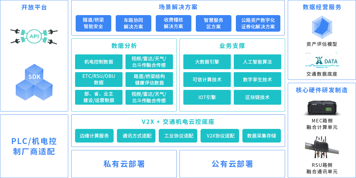 中路智链智慧交通板块,立足公路管理体制和业务需求,以大数据、人工智能、区块链技术驱动,深度定制的感知设备、传感器原件、互联网通讯技术、物联网技 术、大数据技术、车路协同技术、区块链技术、GIS/GPS技术等,并能够通过硬件层,数据层、业务层、系统层等不同方面与部级、省级、地方系统对接。