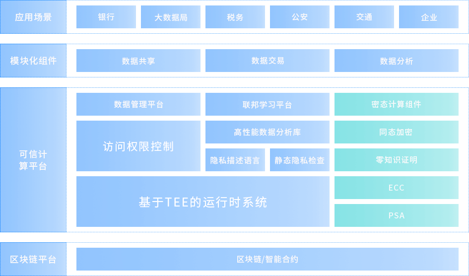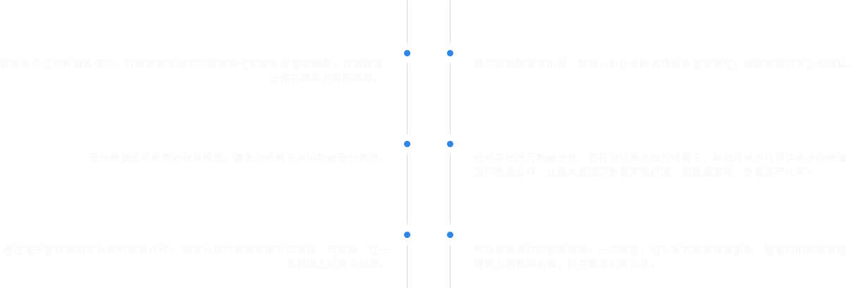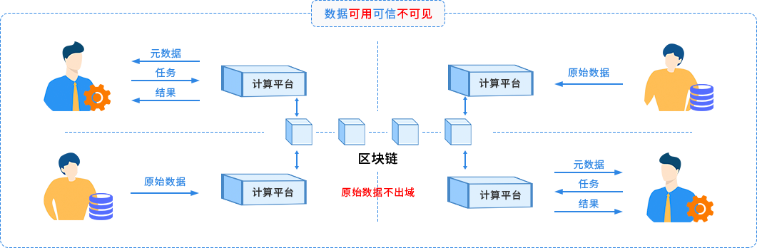 数据要素流通三大痛点:数据使用者滥用个人隐私 – “可用不可见”; 数据所有者对数据不信任 – “可用不可取” ; 缺乏数据全生命周期活动的安全环境 – “区块链全周期行为审计” 。