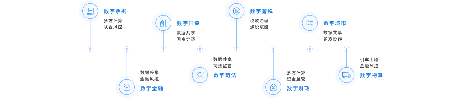 数字政企产品板块适用于税务、工商、金融、社保、市场监管、海关、公安、司法等政府多部门以及央属企业、国有企业之间的数据打通,可构建可信的数据通 道,有效形成数据安全防护,实现数据流通的有效监管、有效流通,形成完整可溯源的数字政企的链条体系。