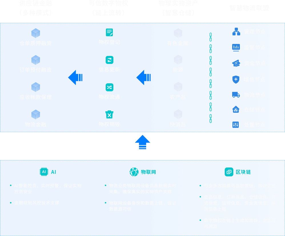 基于区块链、物联网、人工智能等新兴金融科技手段,对实物资产锚定上链,通过科技赋能和系统对接,将传统商品流通转化为安全可靠、资产穿透、具备良好流 通性的数据资产,实现产业链债权、货权资产数字化,解决物流供应链上下游之间交易摩擦、信息不对称、数据互认难、物流效率底的痛点问题。