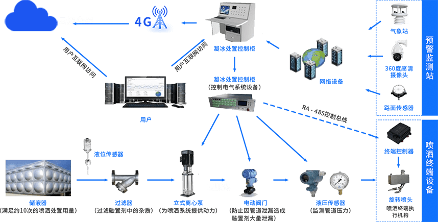 借助先进的交通气象环境传感器技术及预测方法,实现对路面温度及路面结冰的精确短临预警,依据监测、研判、预警结果,适时启动系统泵站和融雪剂溶液喷洒