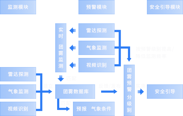 在团雾的生成阶段、成熟阶段、消亡阶段的前期进行科学预报。发生团雾,第一时间对团雾进行预警。预警模块根据已获得的团雾数据库,可以对发生的团雾进行